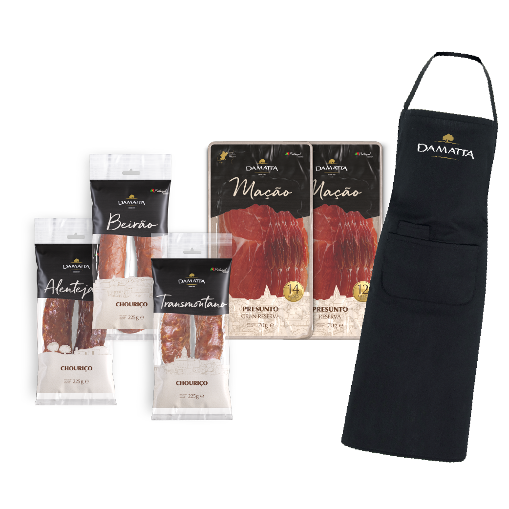 Neste cabaz vai encontrar um oferta diversificada dos melhores produtos da marca Damatta, onde o saber fazer ancestral exalta o verdadeiro sabor da tradição. Aqui vai poder provar 3 chouriços regionais, Alentejano, Beirão e Transmontano, em embalagens de 225g, e ainda dois presuntos com tempos de cura diferentes, 12 meses e 14 meses, em embalagens de 70g. Juntámos ainda à oferta um elegante avental.